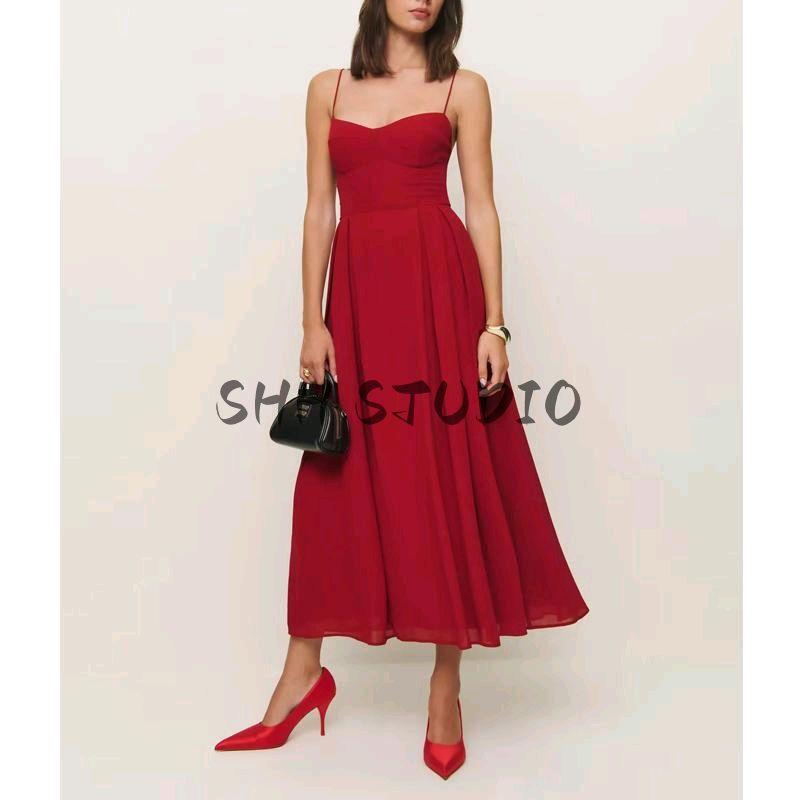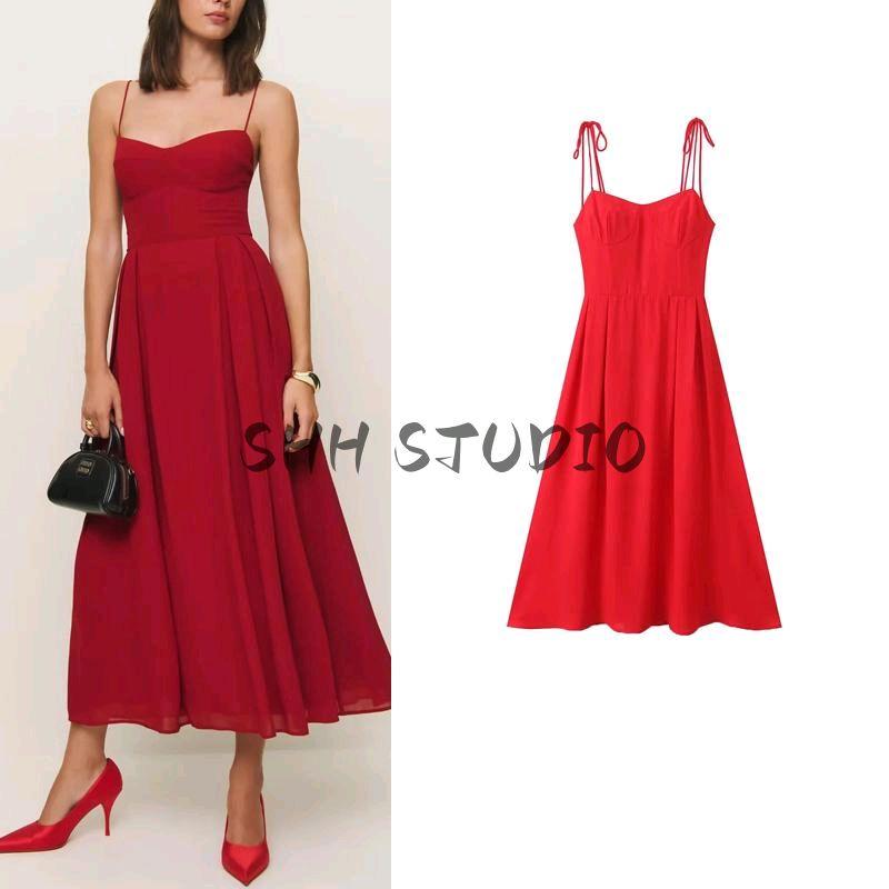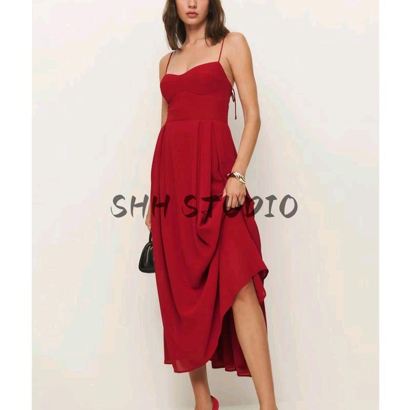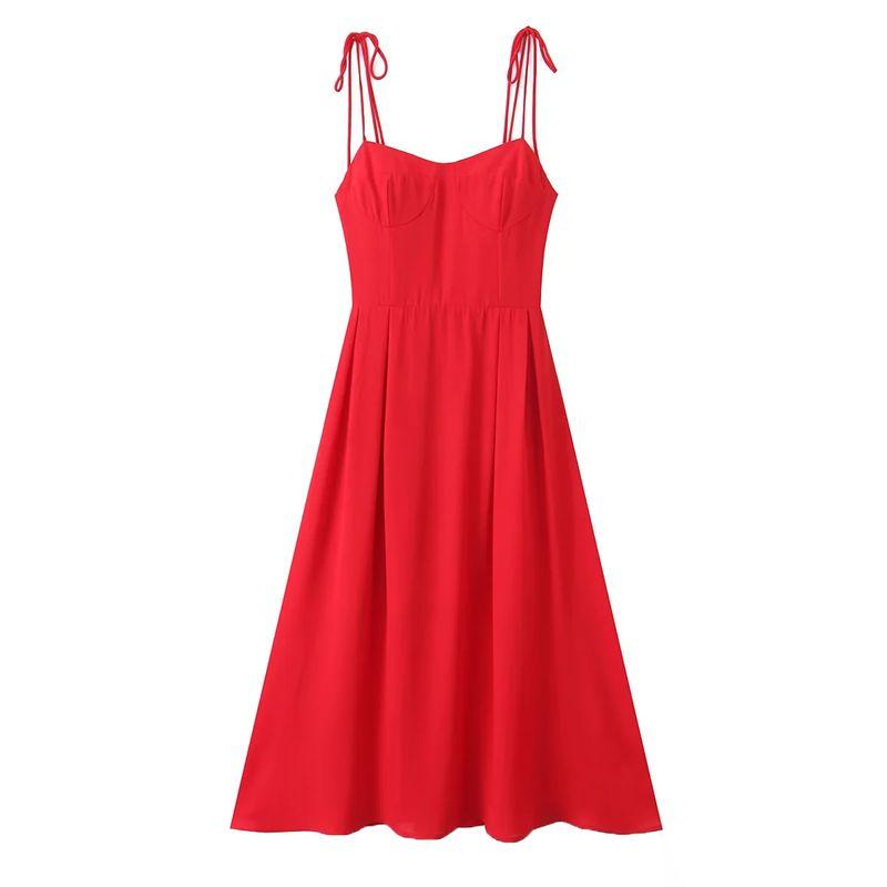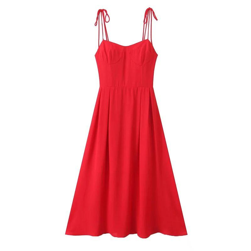 Spring New Women's Clothing French Style Retro Pure Color Figure Flattering Cinched Waist Lace-up Long Midi Skirt Sling Dress