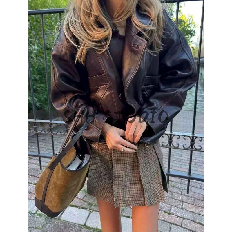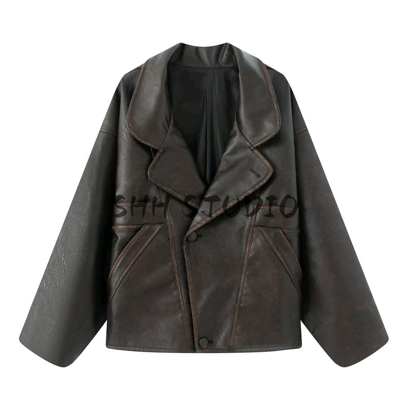 Осень Новая Женская Одежда Французский Стиль Повседневный Стиль Отложной Воротник Длинные Рукава Молния Полиуретановая Кожа Короткая Куртка