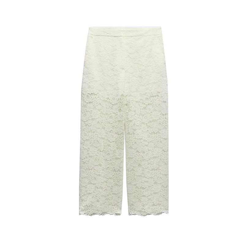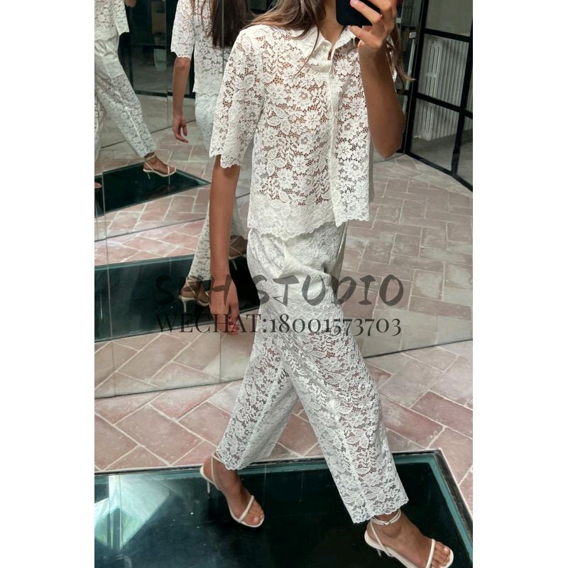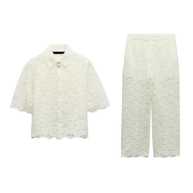 Spring New Lapel Short sleeve Lace Short Top 3254490 High Waist Straight Ankle-length Pants 3278490