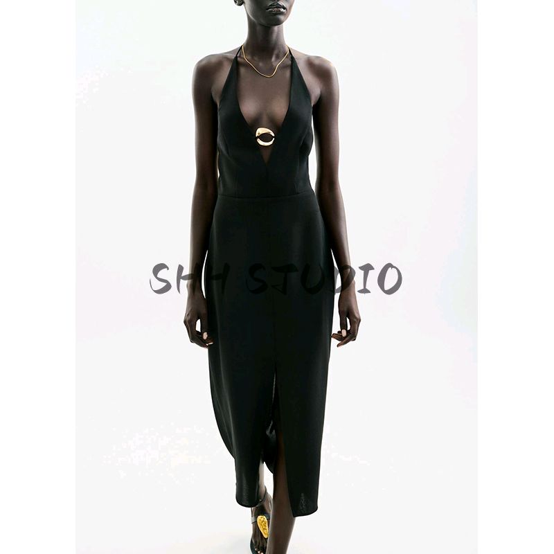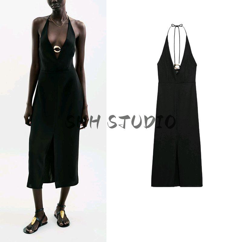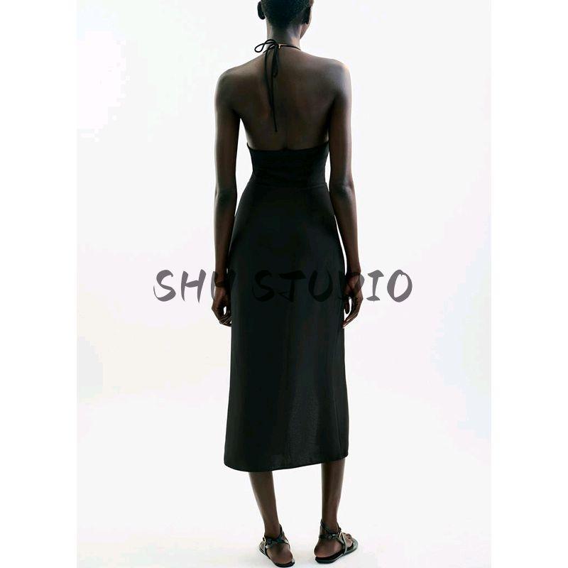Summer Women's Clothing Bows Series Decoration Hanging Collar Gold Inlaid Open Back Midi Skirt Dress 2298098