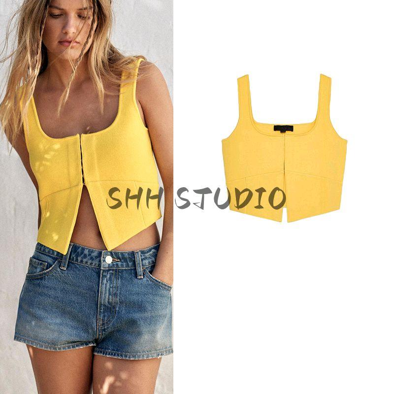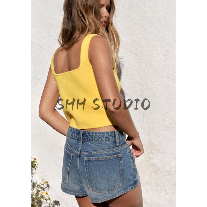 Spring and Summer New Women's Clothing Hidden Snap Button Minimalist round Neck Wide Shoulder Strap Knitting Short Top 5536040