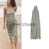 Summer New Product Women's Clothes Seaside Vacation Style Ruched Decoration Hanging Collar Midi Skirt Long Dress 6929187