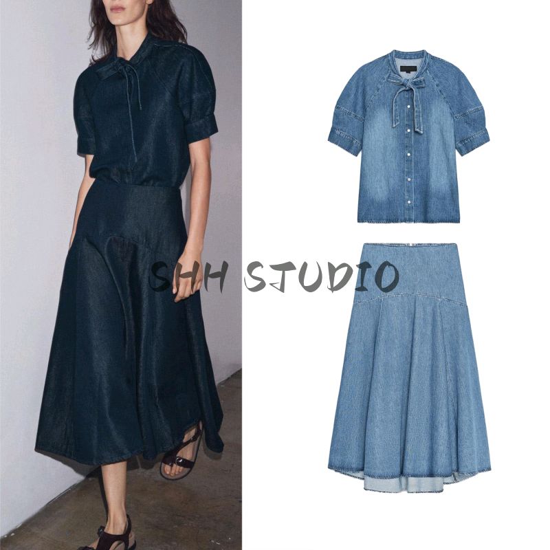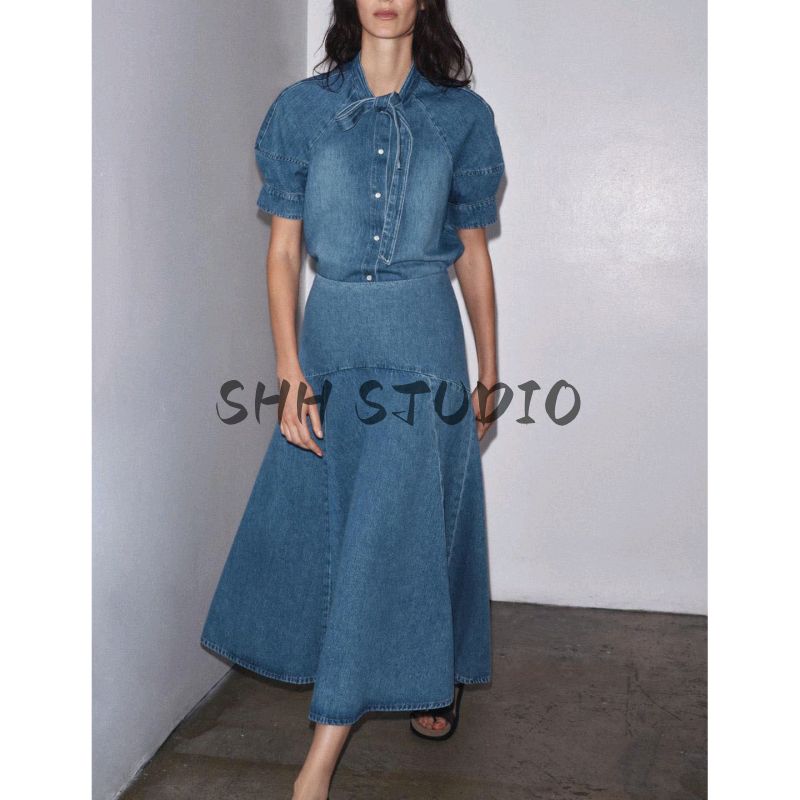Autumn New Bowknot Decoration Demin shirt 5216249 Mid-Waist Denim A Word Midi Dress 9863240