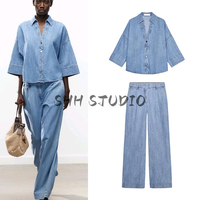 Wide Sleeve Minimalist Casual Denim Shirt 1879025 High Waist Pleated Wide Leg Leisure Casual Denim 1879026