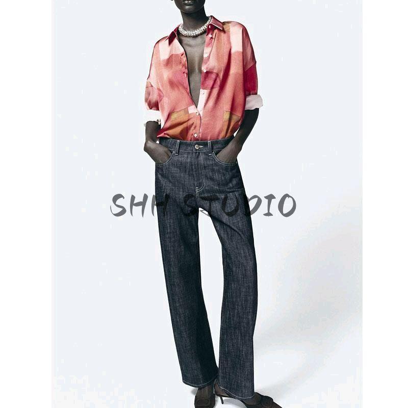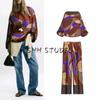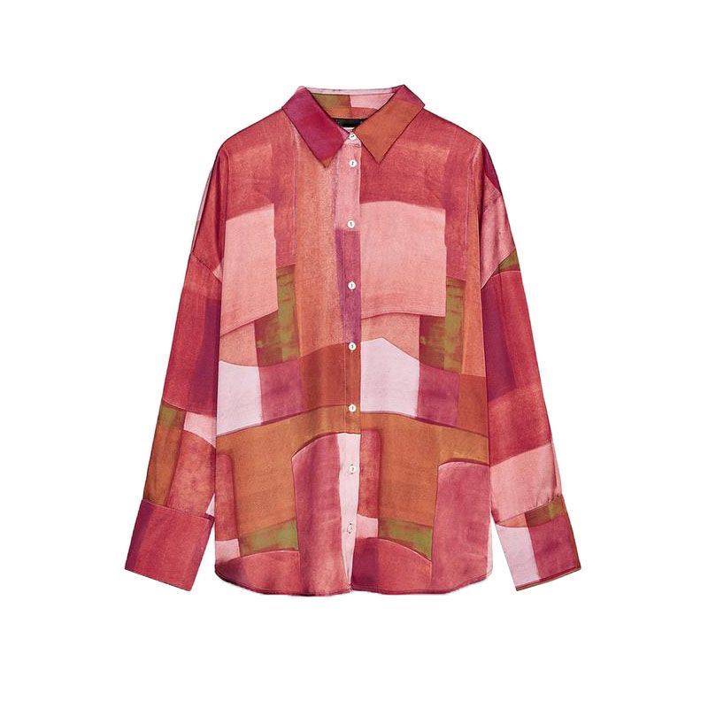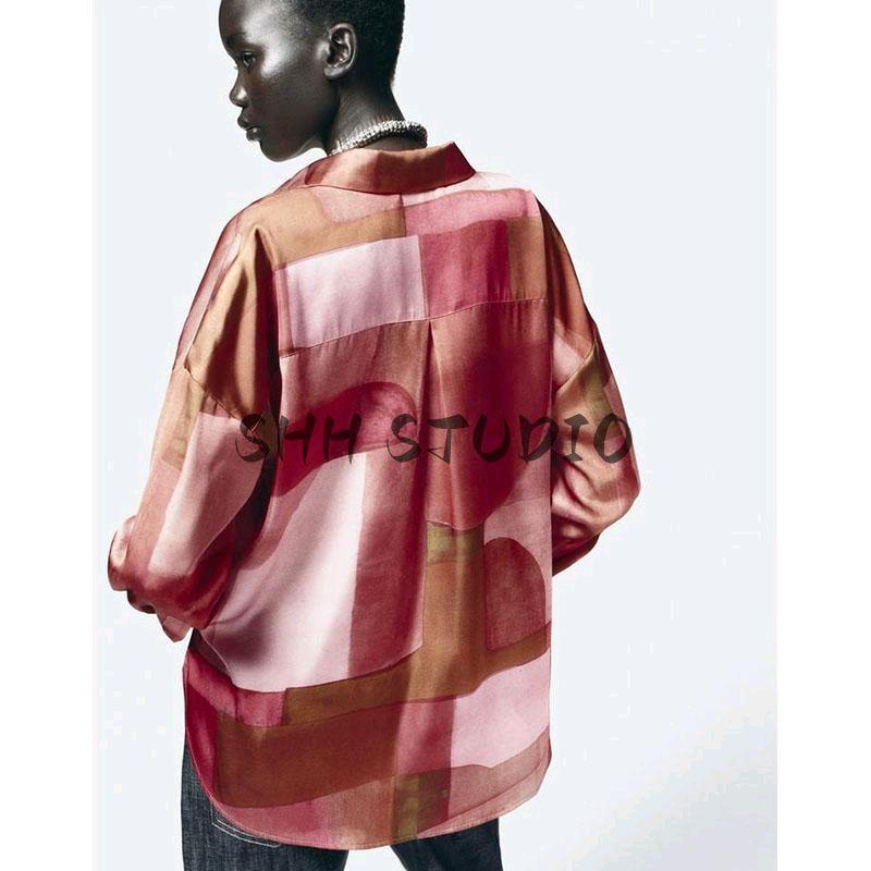 Spring New Women's Clothing French Geometric Figure Print Loose Silk Satin Texture Long Sleeves Shirt 2628188