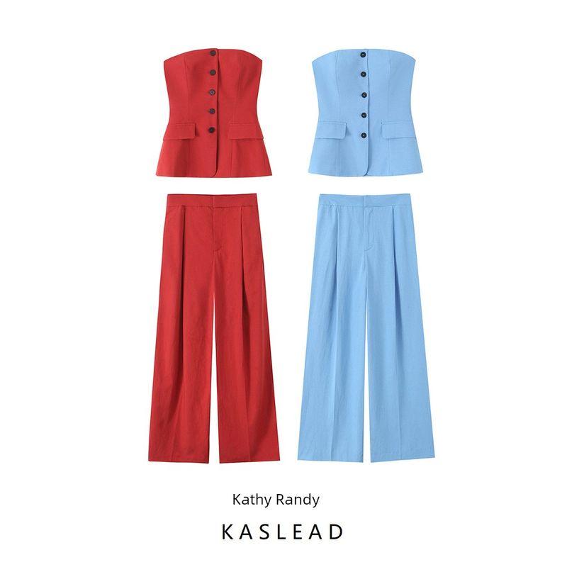 Kaslead New Women clothes Western Style Stretch Neck Collar Top Long Pleated Pants 0085339 3152433