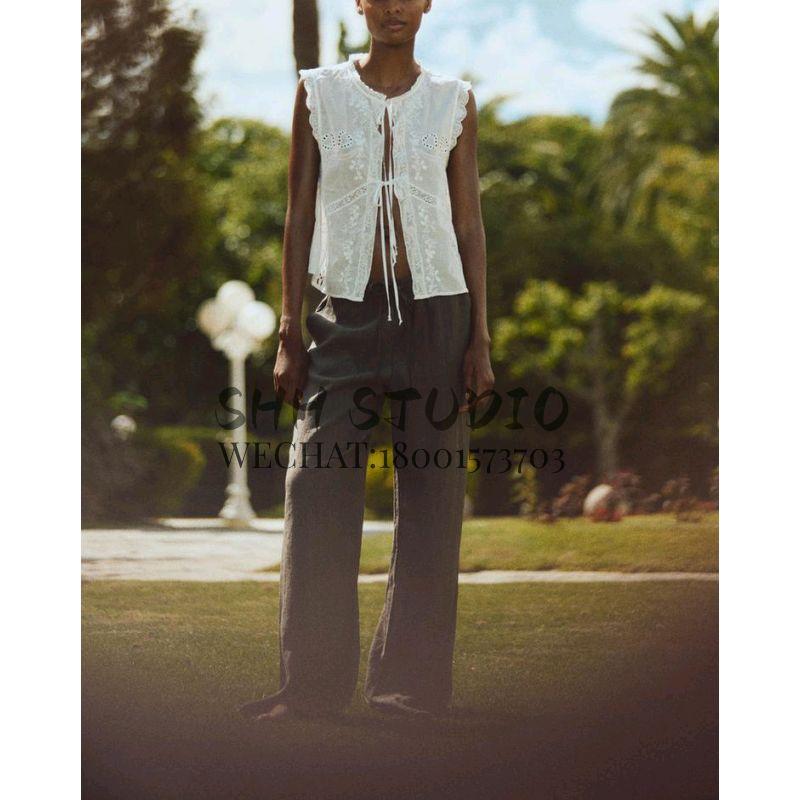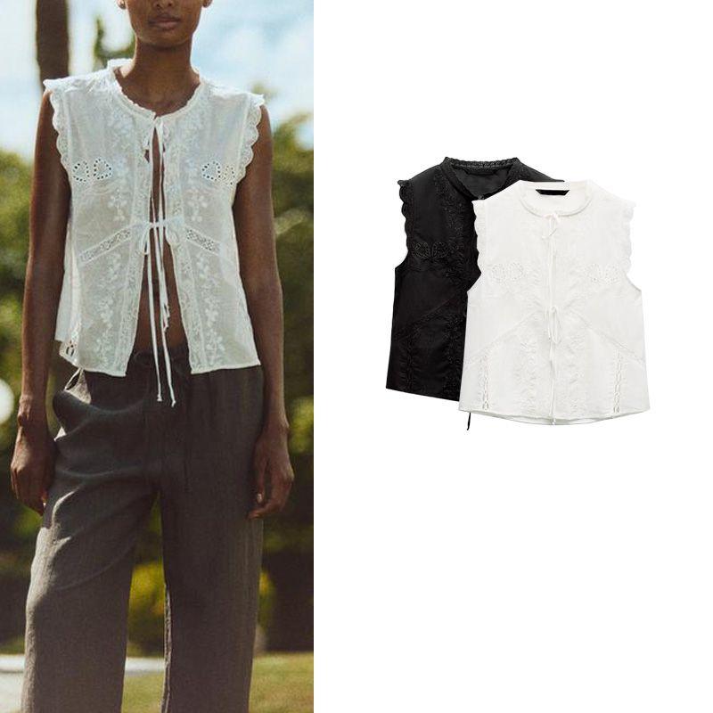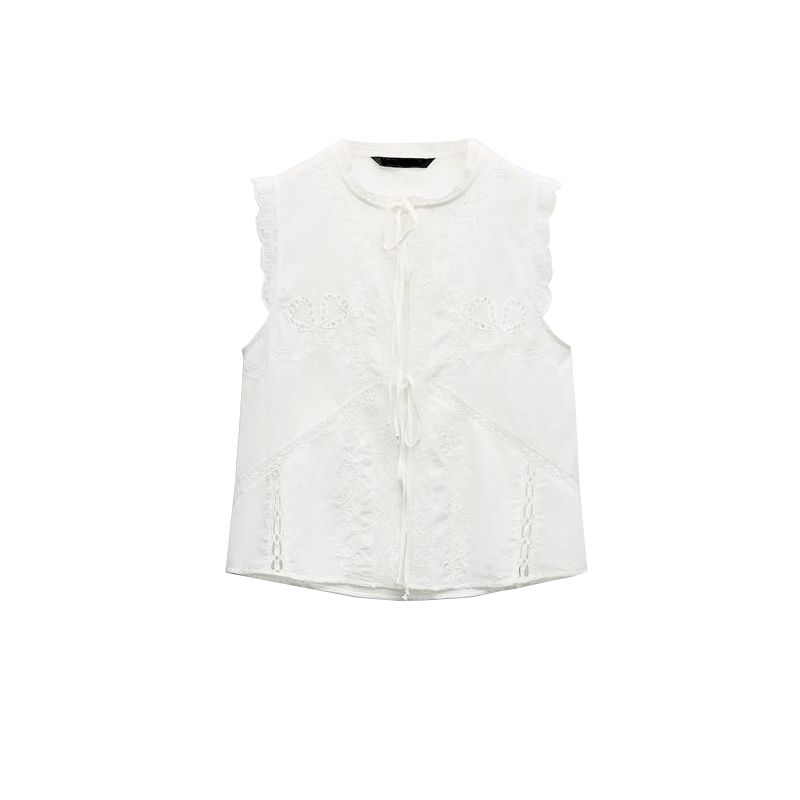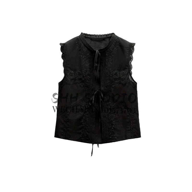 Spring New Women clothes Sweet round Neck Sleeveless Vertical Lace Bowknot Decoration Embroidery Top 0881070