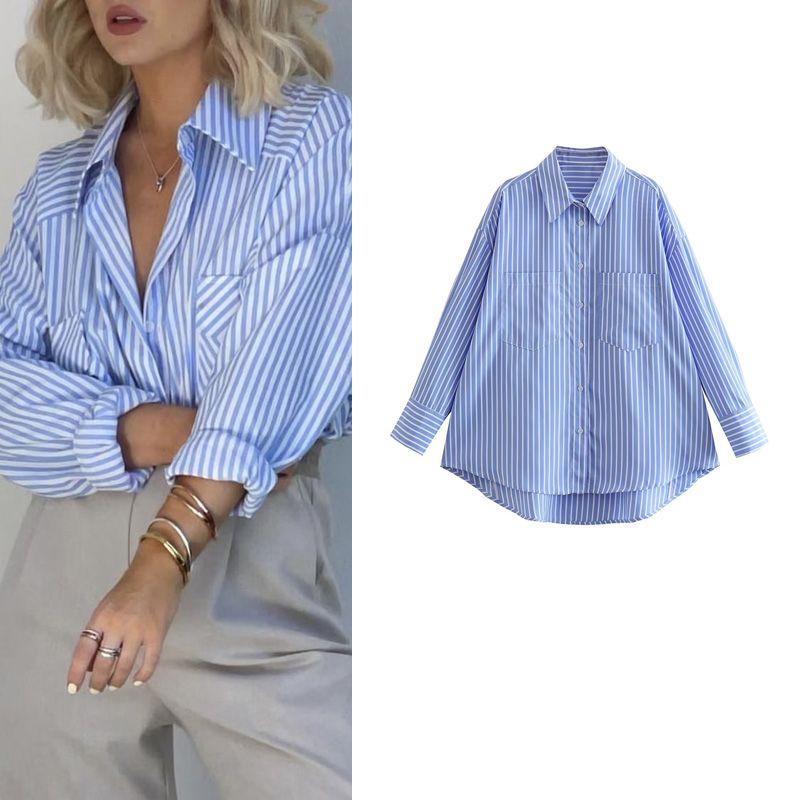 Весна Новое поступление Женская одежда Длинные рукава Лацкан Универсальный Повседневный Свободный Внутренний наряд Платье-бандаж Топы Сине-белая полоска Рубашка