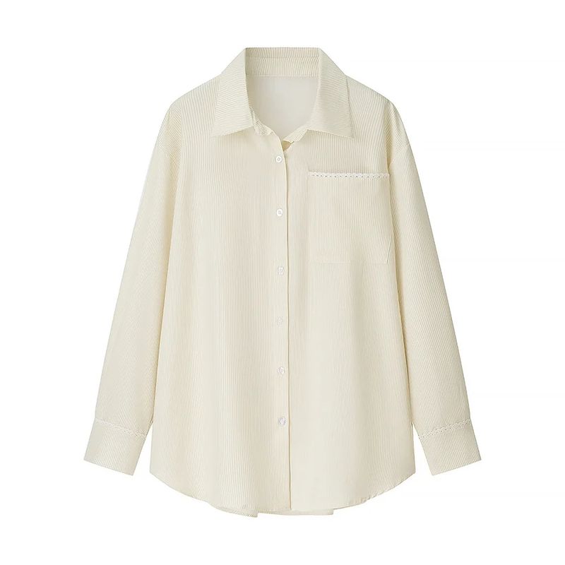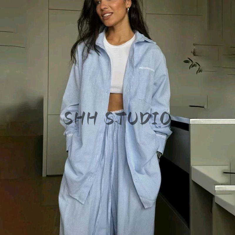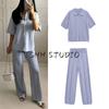 Autumn New Arrival Women clothes Two-piece Set Polo Collar Loose Long sleeve Stripe Shirts Casual Straight Wide Leg Trousers