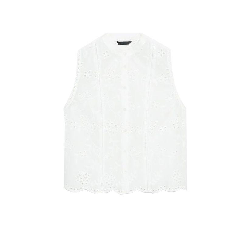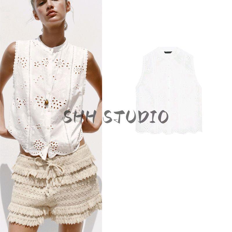 Summer New Product Women's Clothes Minimalist Style Button Decoration Cut Out Embroidered Crew Neck Sleeveless Shirt Tops 8126947
