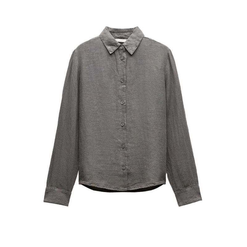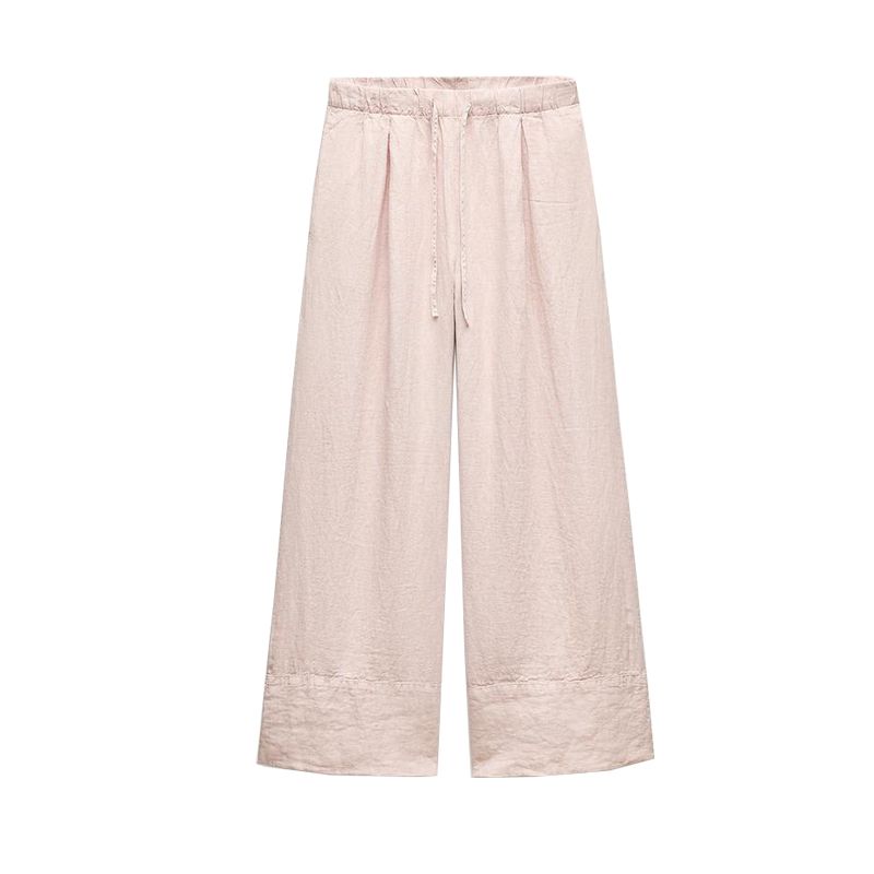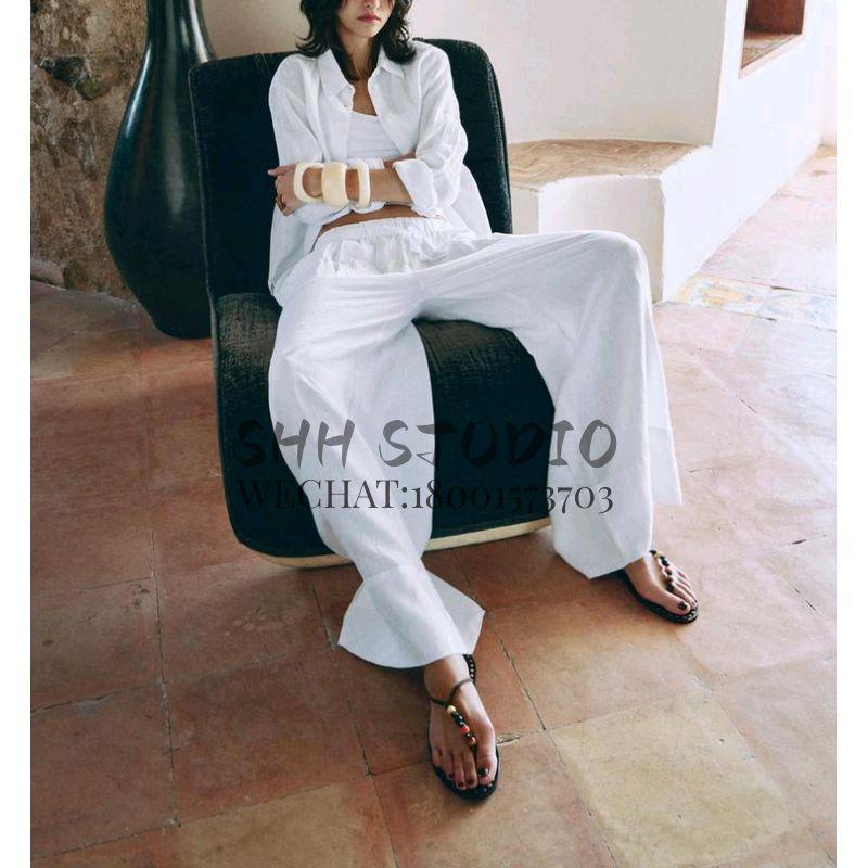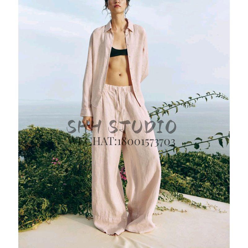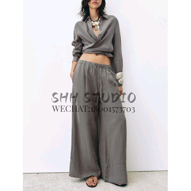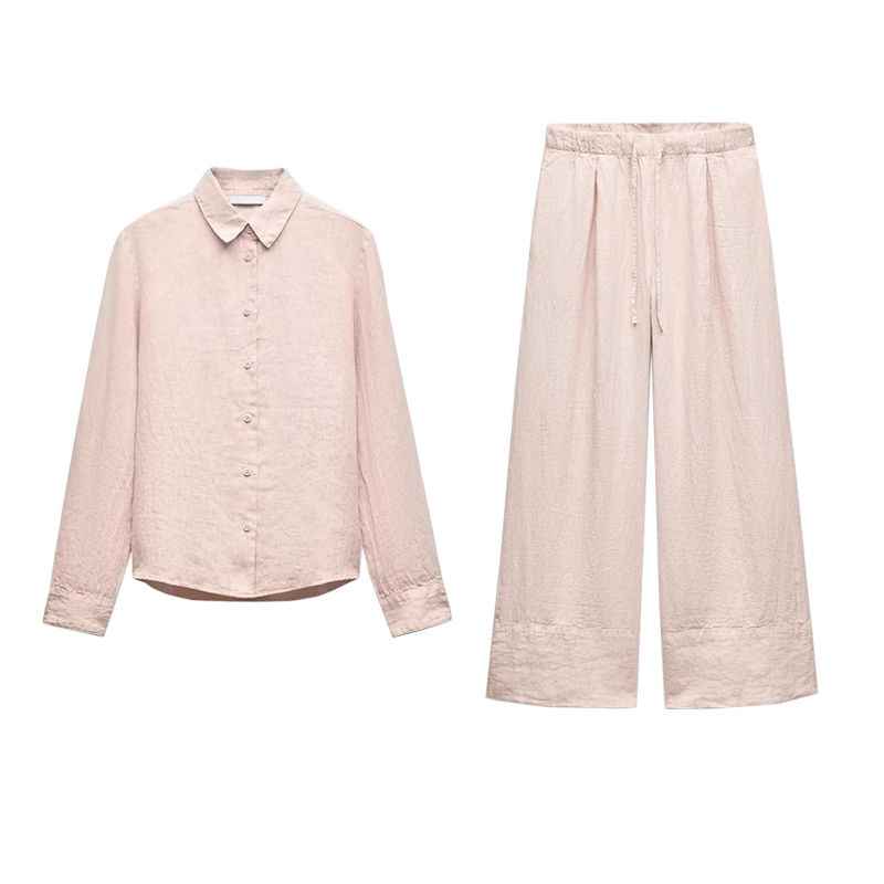Spring New Lapel Long Sleeves Linen Blended Shirt 4877100 Mid Waist Shoelace Wide Leg Pants 4877101