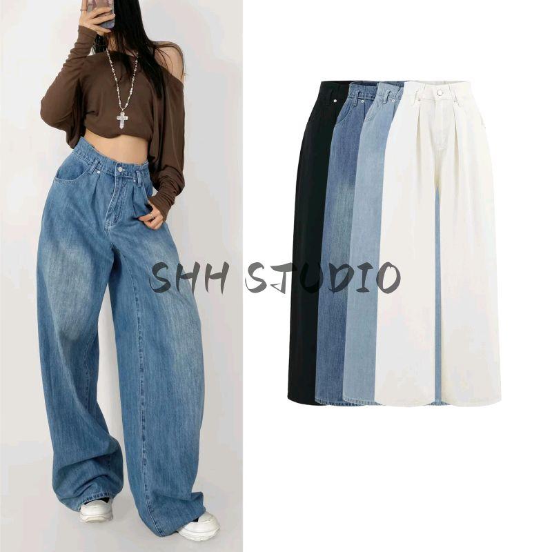 Summer New Product Women's Clothes French Style Casual Style Slim Looking Waist Pinch Pleated High Waist Wide Leg Mop Long Denim