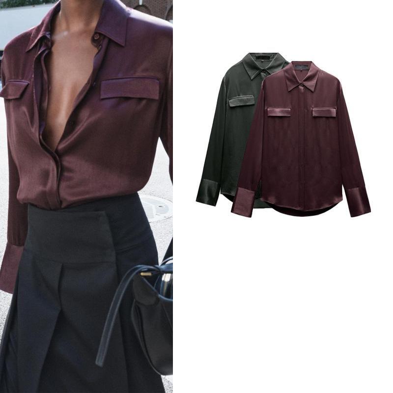 Fall and Winter New Women's Clothing Fashion Air Outlet Pocket Decoration Silk Satin Texture Lapel Long Sleeve Shirt Tops 8987213