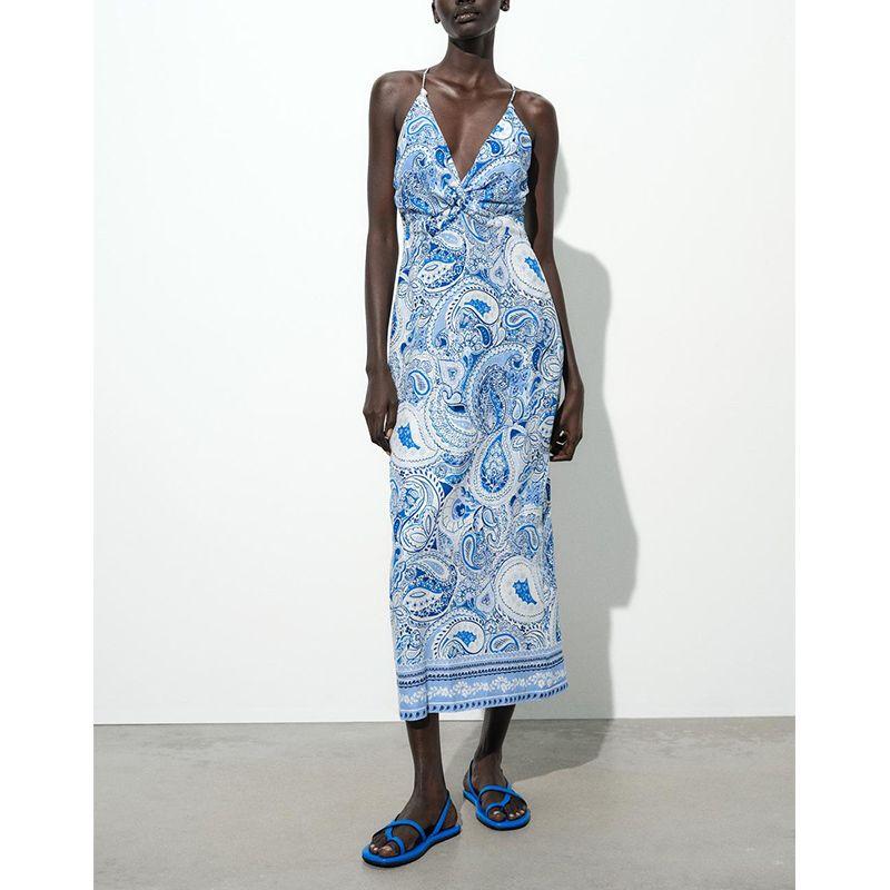 Summer New Women clothes European and American Leisure V-neck Knot Decoration Print Fashion Temperament Midi Dress 3558671
