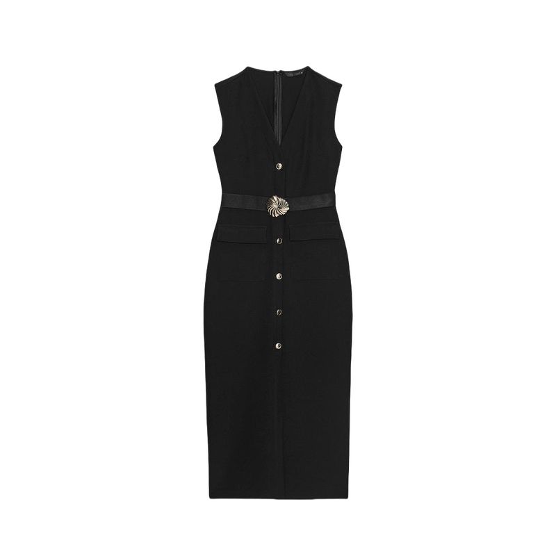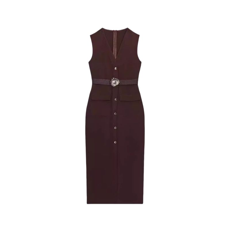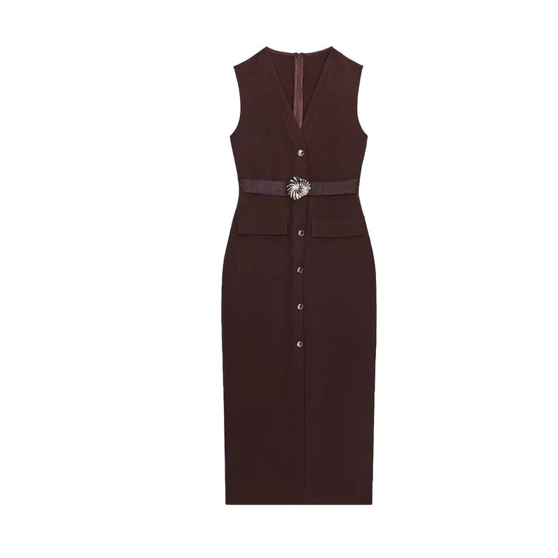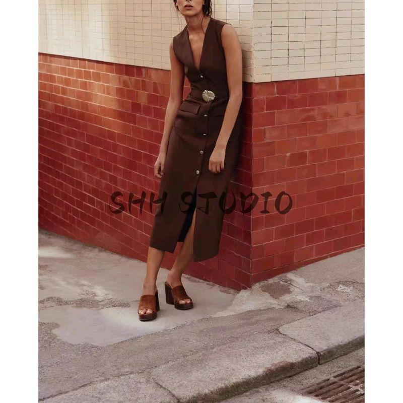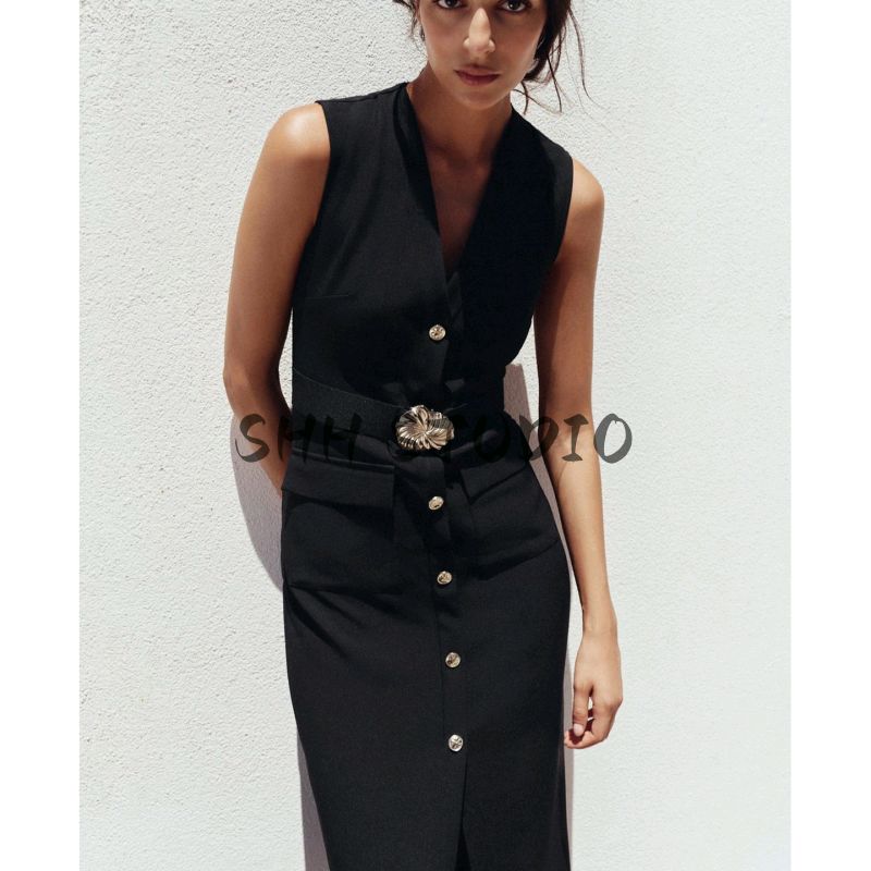 Летняя Новинка Женская Одежда круглый Вырез Без рукавов Декорация с Ложными Пуговицами с Поясом Креповое Миди Платье-Юбка 3897166