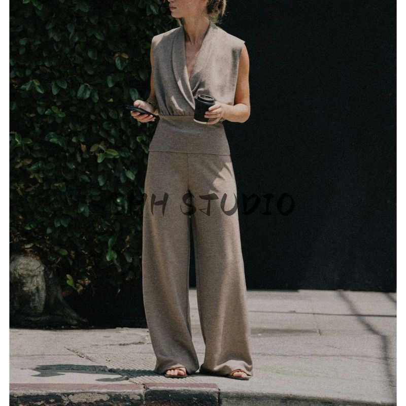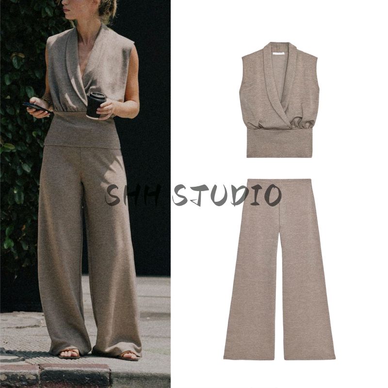 Seersucker Double Placket Top 5067164 Pique Basic Mid Waist Wide Leg Casual Trousers 5067165