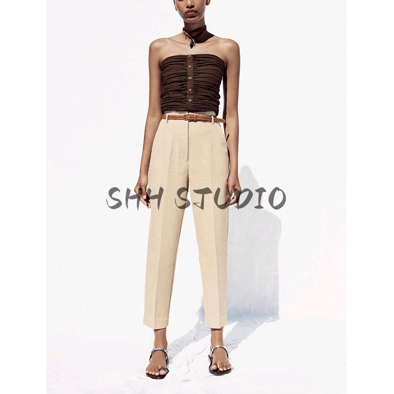 Summer New Product Women's Clothes French Style Design with Belt Vacation Style High Waist Ankle-Length Pants 8372124
