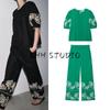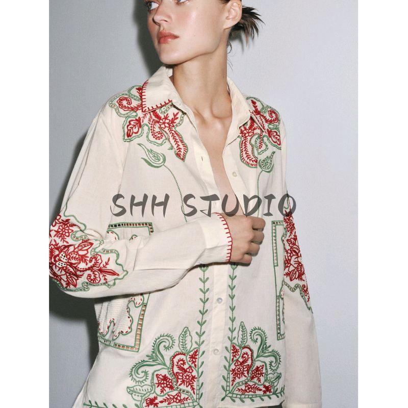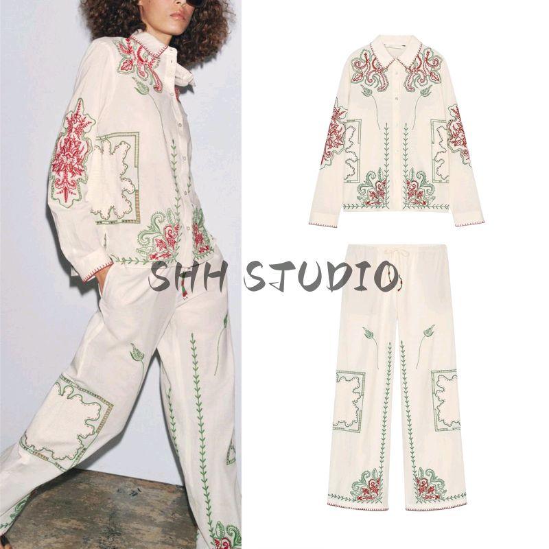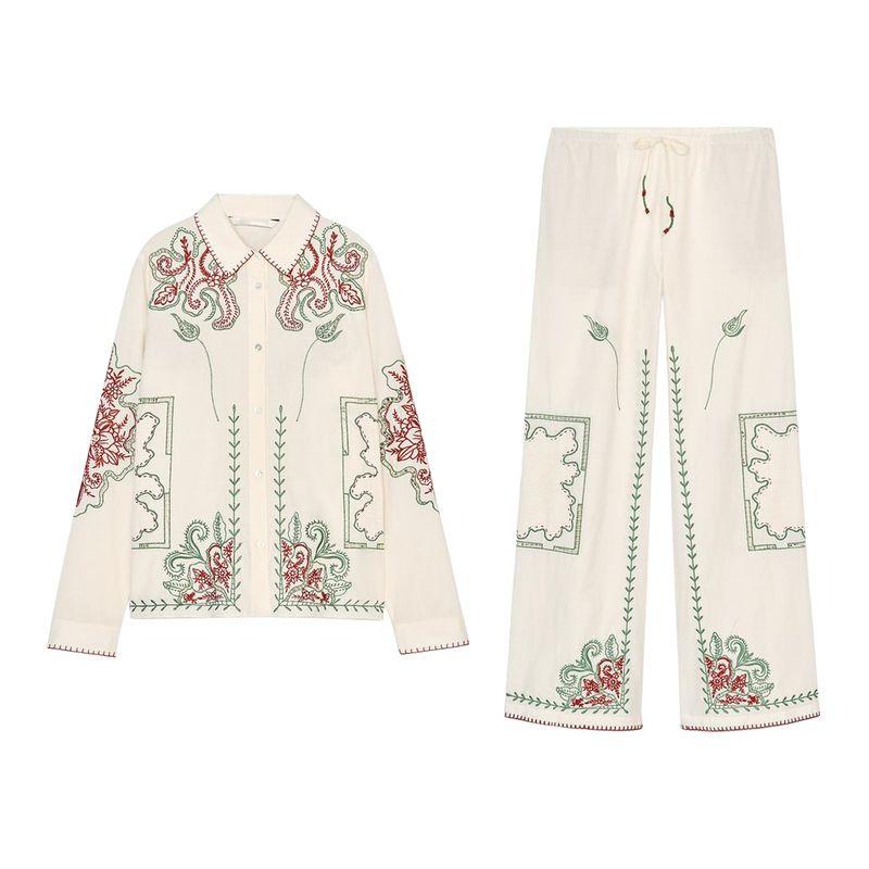 Хлопковый лацкан, длинные рукава, однобортная, контрастная цветная вышивка, декоративная рубашка 5107065, повседневные брюки 5107064