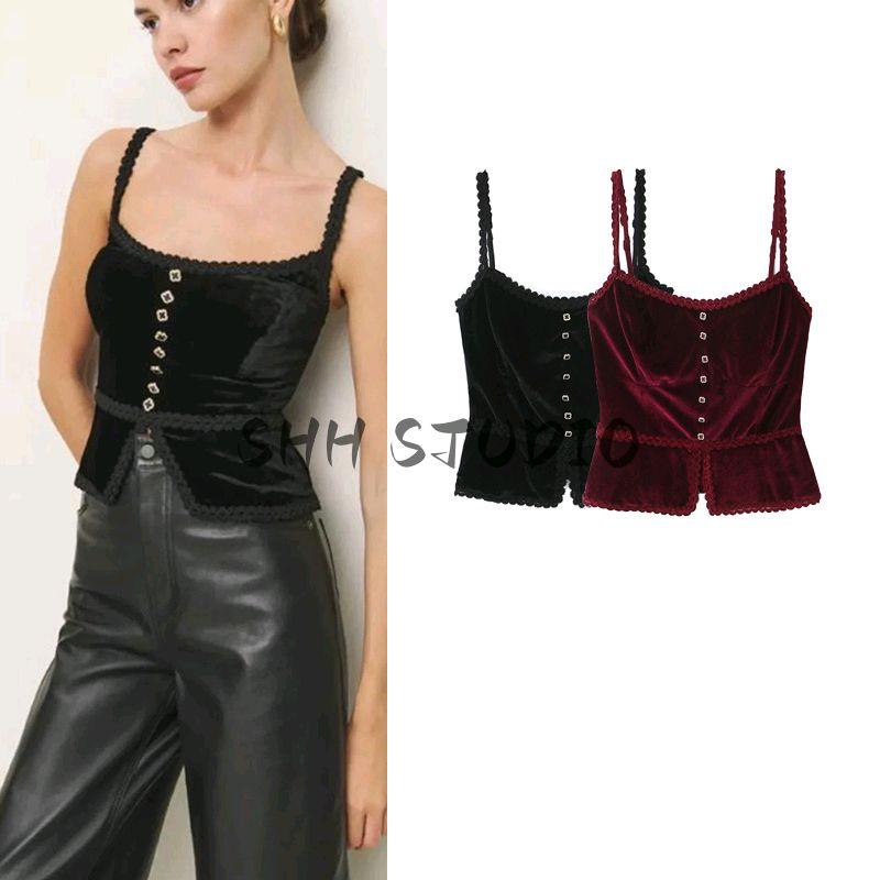 Spring New Women's Clothing French Sexy Style Lace Silm Four-Leaf Clover Decorative Buttons Velvet Spaghetti Straps Vest
