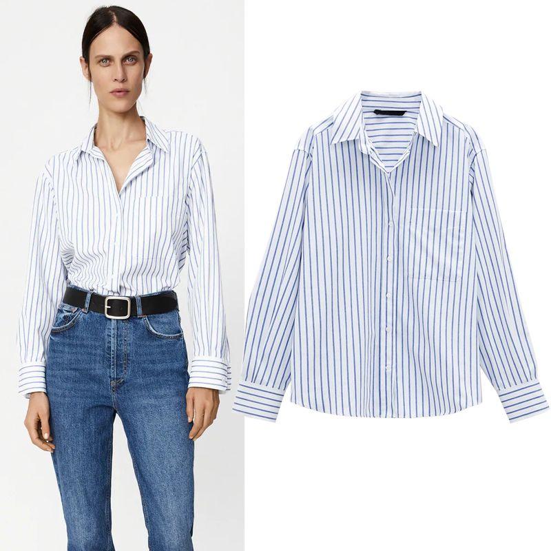 Za Fall and Winter White Base Shirt Tops Loose Long Sleeves Single Striped Style with Pockets Shirt Female 2173262 7727760