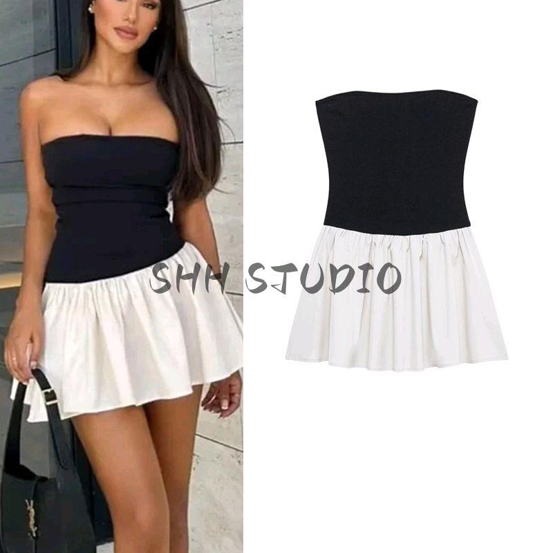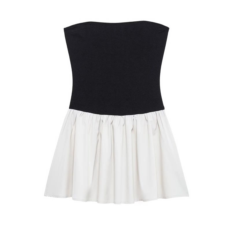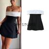 Women's Spring Clothing French Style Sexy Word Collar Sexy Contrast Color Stitching Pleated Silm High Waist A- line Dress
