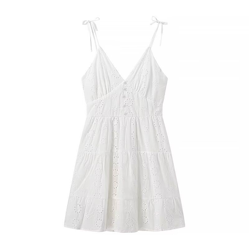 Kaslead New Arrival Women's Clothing Fashion Style Fashion Casual Minimalist Cotton Cloth Embroider V-neck Strap Dress