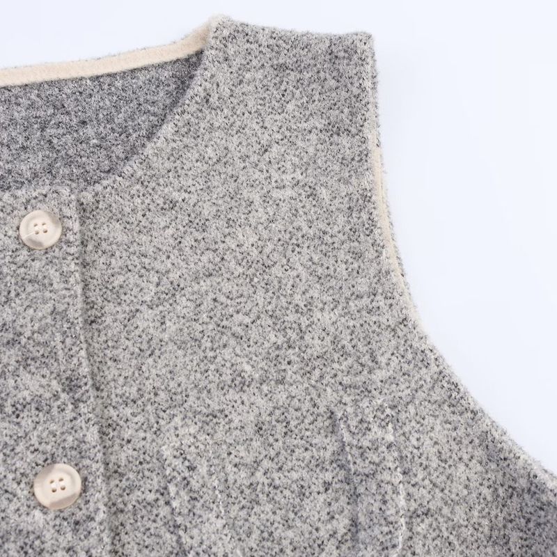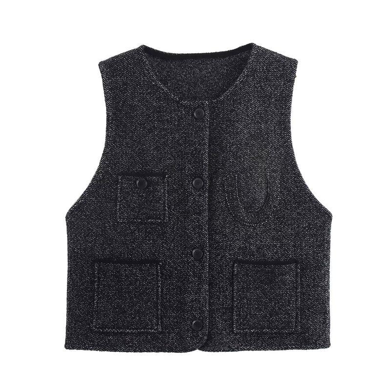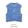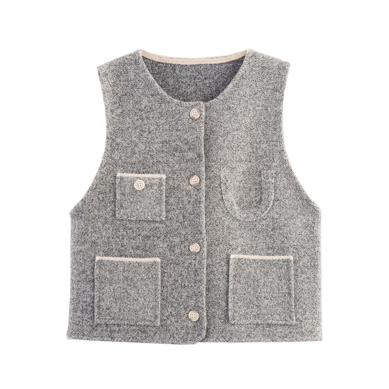 Kaslead New Women clothes Western Style Fashion Bright Silk Graceful round Neck Pocket Cardigan Sweater vest