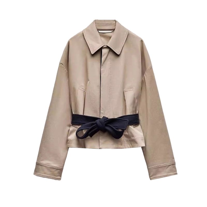 Осень Новая Женская Одежда Повседневный Стиль Контрастный Пояс Лацкан Длинные Рукава Короткая Куртка 8427347