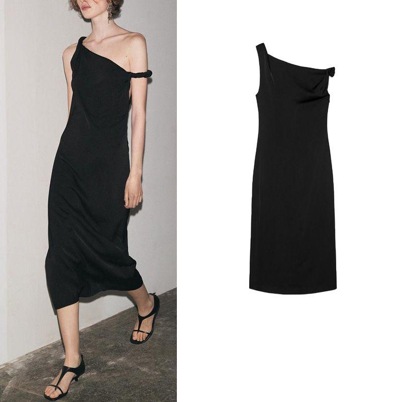 Summer New Product Women's Clothes French Evening Dress Black Diagonal Collar Silk Satin Texture Midi Skirt Dress 5289043