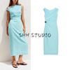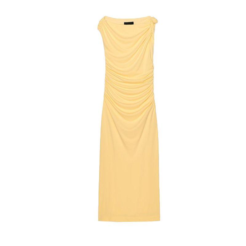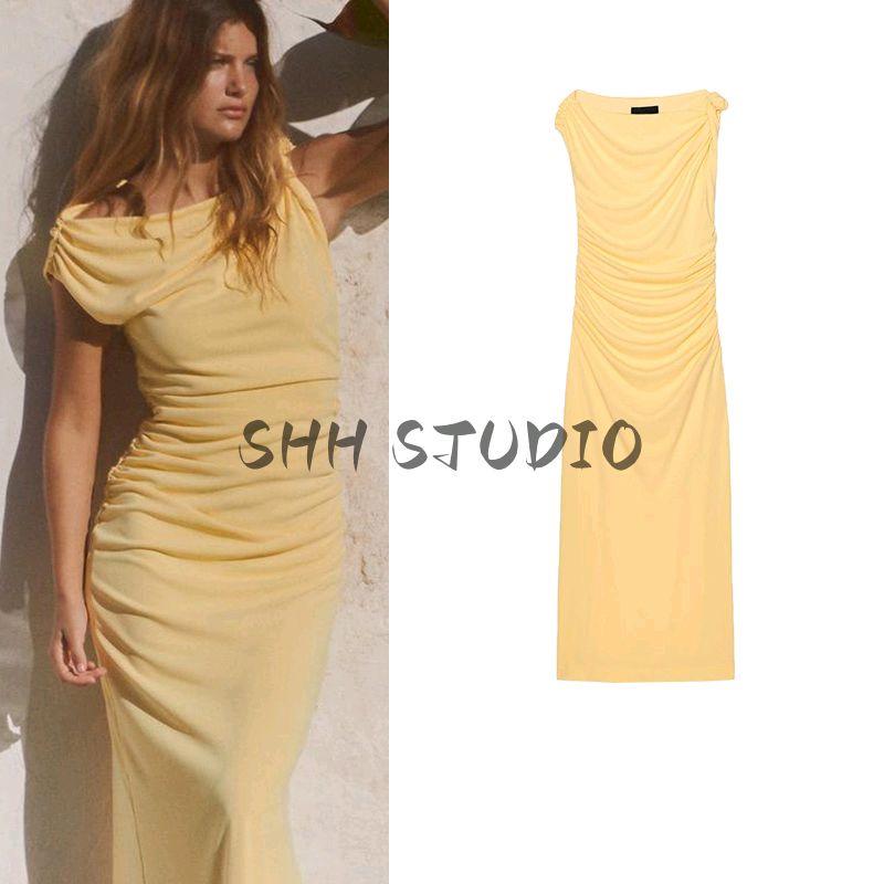 Spring New Women's Clothing French Vacation Style Minimalist Ruched Asymmetric Midi Skirt Dress 2477262
