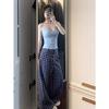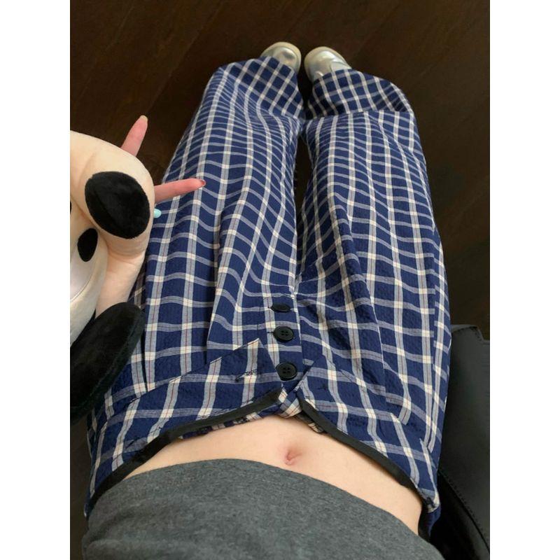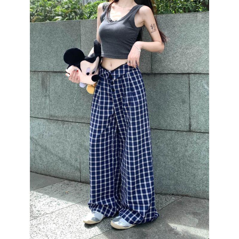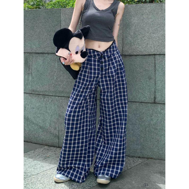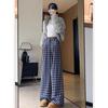 Blue Retro Gingham Early Autumn High Waist Loose Casual Pants