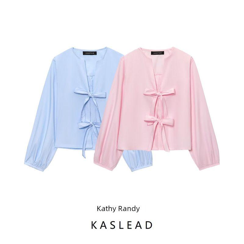 Kaslead New Women clothes Western Style Fashion Bowknot Decoration Stripe Poplin Shirts 0387058