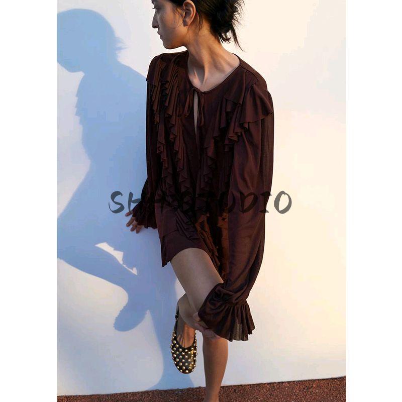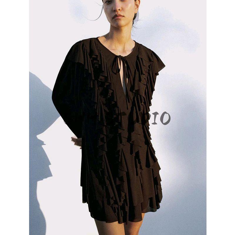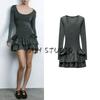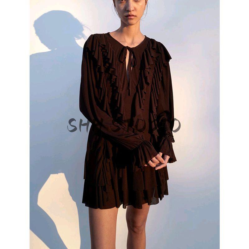 Spring New Women's Clothing Bows Lace-up Crew Neck Long Sleeves Laminated Decoration Short Dress 4813320