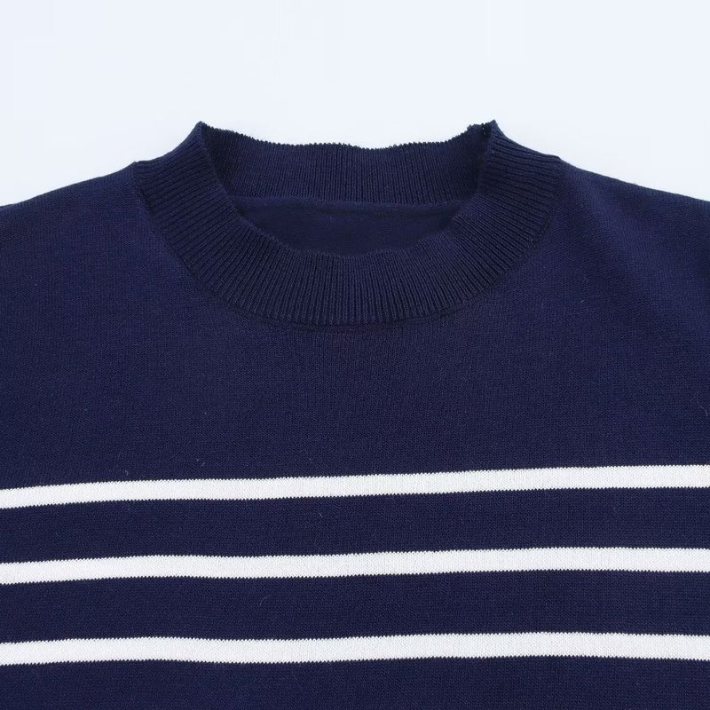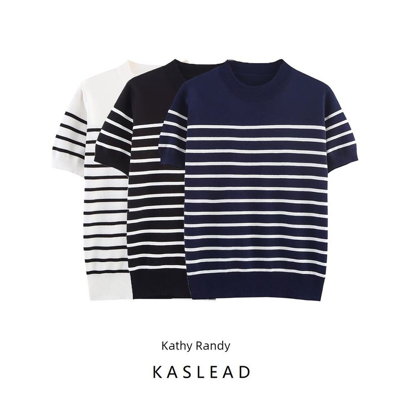 Kaslead New Women clothes Western Style Fashion Simple and Versatile Stripe Pullover round Neck Short sleeve Top