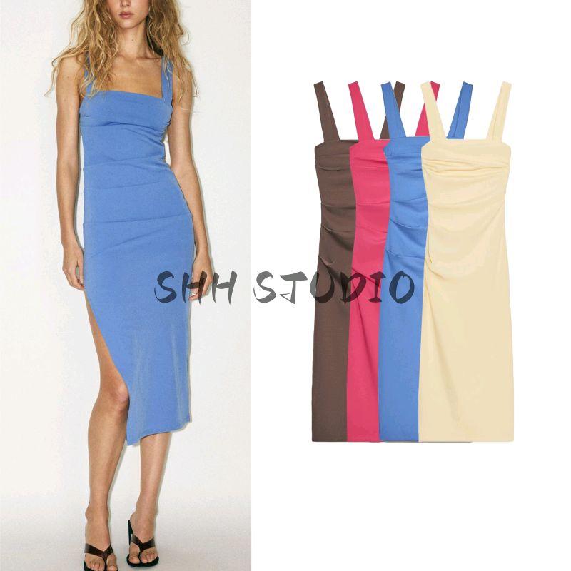 Летний Новый Продукт Женская Одежда Стиль Морского Отдыха Слим Плиссированное Квадратный Вырез На Бретелях Миди Юбка Платье 3641848