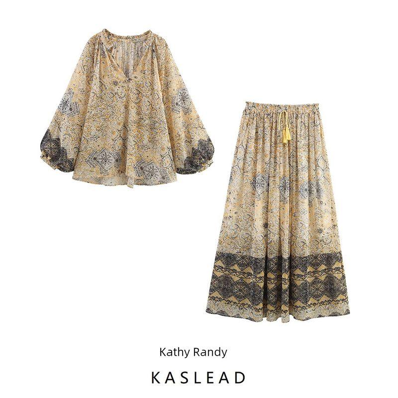 Kaslead New Women clothes Western Style Metal Color Thread Print Shirts Skirt 1821223 1821221