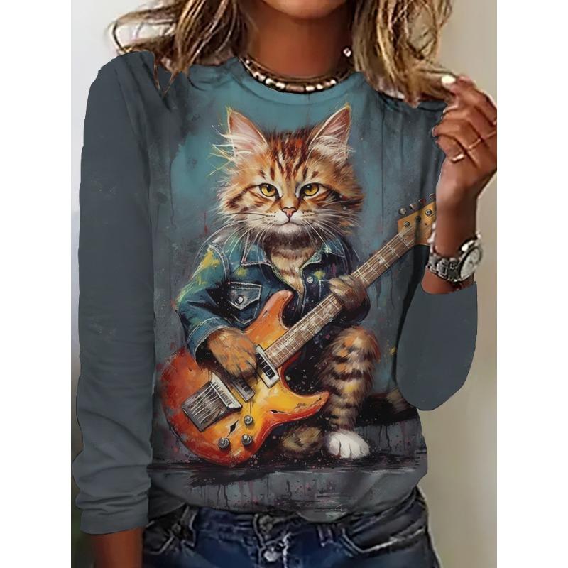 Осенняя женская футболка с длинным рукавом, милым принтом кошки, уличный кэжуал, круглый вырез, пуловер, одежда оверсайз