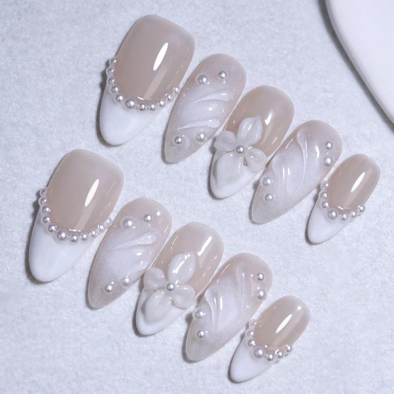 3D Цветочный и Водный Рябь Дизайн Ногтей Белый и Телесный Цвет Французский Ручной Маникюр 100% Ручная Работа Накладные Ногти Миндаль 10 Шт. Накладные Кончики Ногтей Многоразовые