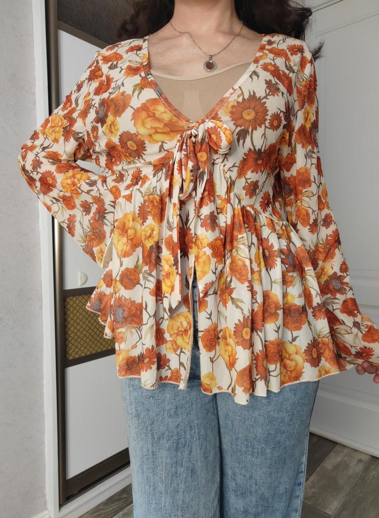 Летняя блуза плюс-сайз У продавца представлена в нескольких расцветках. Размерный ряд от 1XL до 4 XL. На мне размер 1XL. На параметры фигуры 93-60-93, рост 163 см села очень свободно. Блуза выполнена из сетчатого материала, к телу ткань приятная, не электризуется, просвечивает сильно, не мнётся. Вырез глубокий V - образный, на завязке, рукава длинные. Строчки все ровные, посторонних запахов нет. Качество хорошее. Детальные замеры блузы в размере 1XL: ОГ - 102 см; ОТ - 90 см; Длина изделия по спинке - 68 см; Рукав - 63 см. Летом будет хорошо смотреться на пляже или как на промо-фото продавца с джинсовами шортами с драниной. В целом вещь интересная, рекомендую!