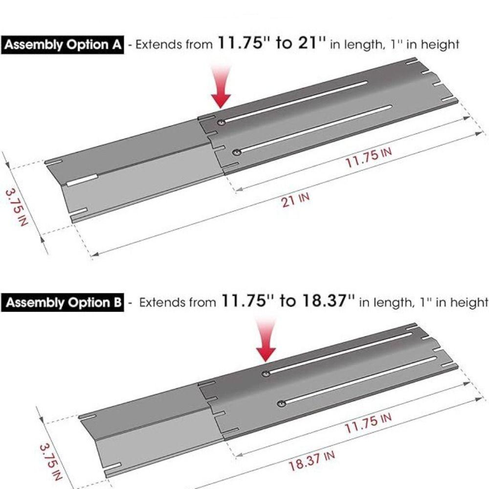 Универсальная регулируемая плита: Замена теплозащитного экрана гриля предназначена для универсального использования.. Два способа установки на ваш выбор. Если вы устанавливаете устройство лицом вперед, его можно увеличить с 11,75 дюймов до 21 дюйма в длину и 3,75 дюйма в ширину.. При обратной установке его можно увеличить только с 11,75 дюймов до 18,8 дюймов в длину.