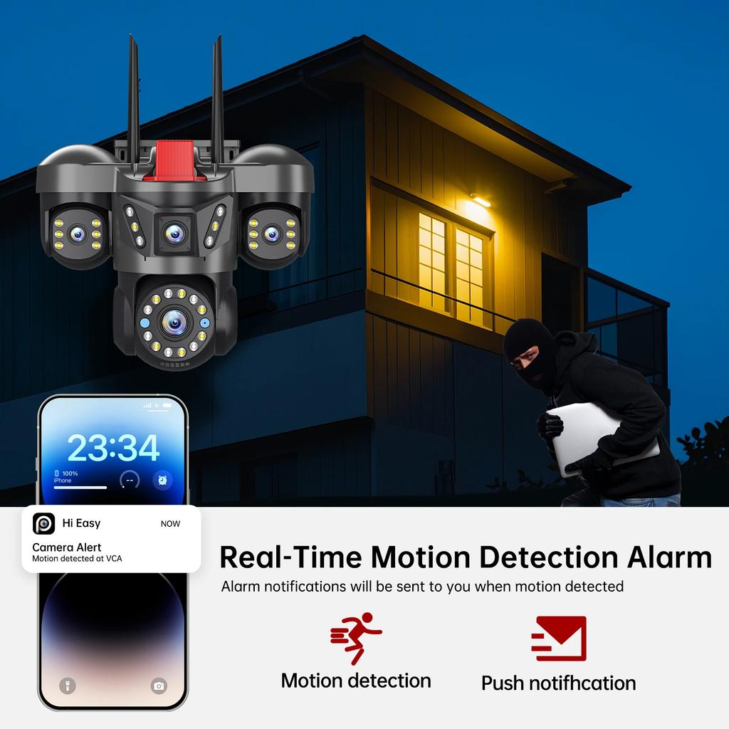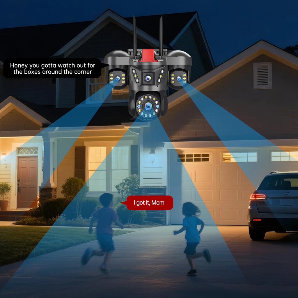 Камера оснащена кронштейном для крепления в углу, а двухобъективная камера обеспечивает двустороннее наблюдение, что особенно удобно для таких мест, как дома уличных торговцев, фермы и склады, а также строительство зданий.