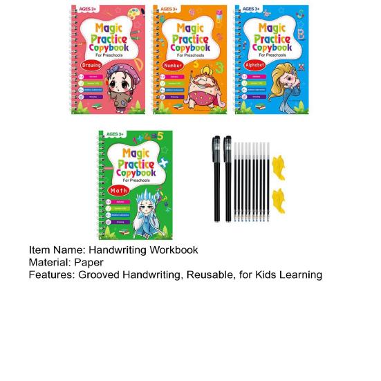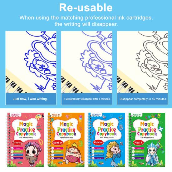 Комплексный обучающий набор: Этот набор, большего размера, чем стандартные, включает 4 детские рабочие тетради для упражнений, охватывающие такие занятия для раннего обучения, как числа, буквы, рисование, сложение и вычитание.. В комплекте 1 ручка, 10 стержней с невидимыми чернилами и подставка для ручки для комфортного письма.
