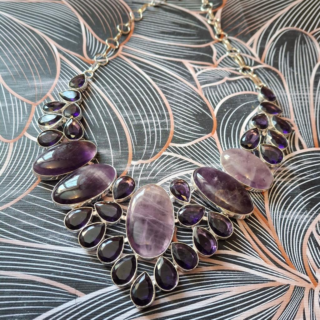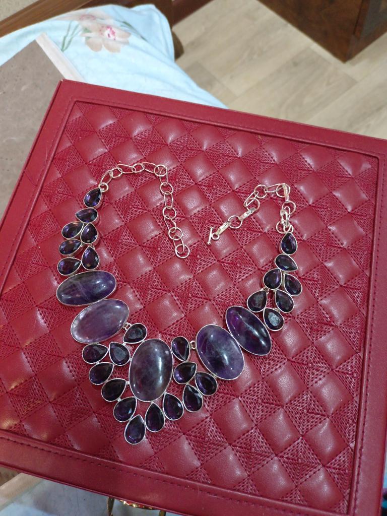 Шикарное серебряное колье (клеймо серебра проставлено) с аметистом шалфей,как на фото .Качественная работа.Прекрасный дизайн.Размер центрального камня 3,3 см × 2,3 см.