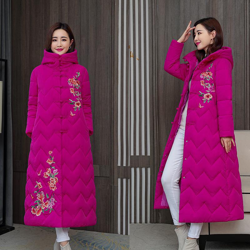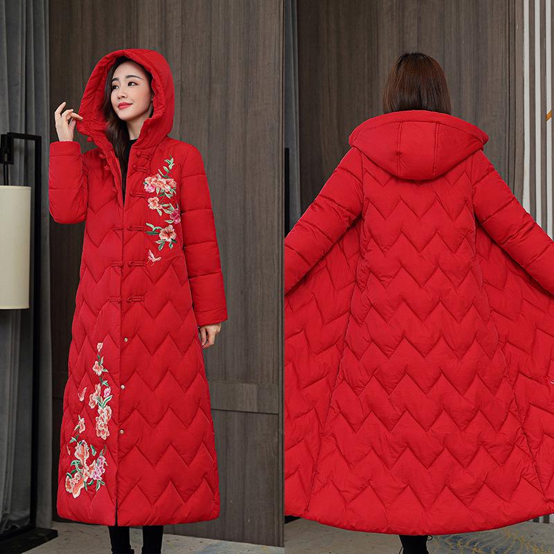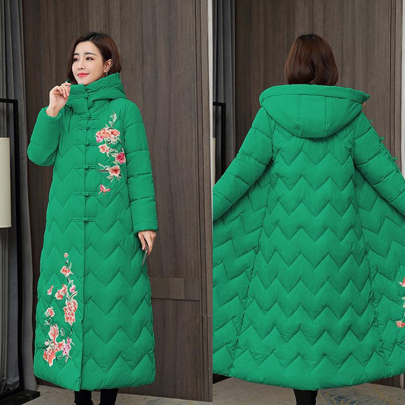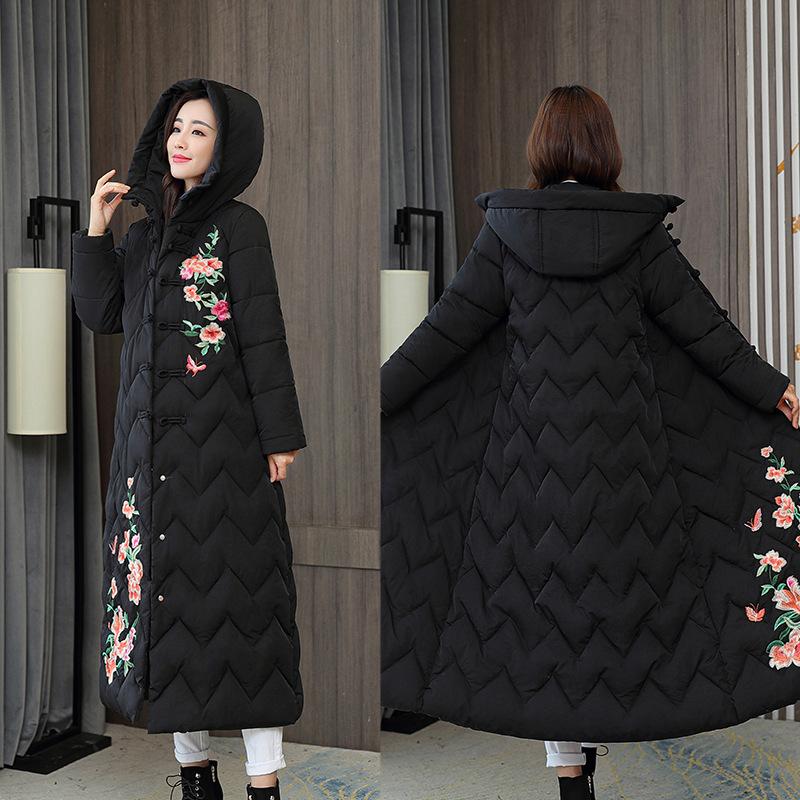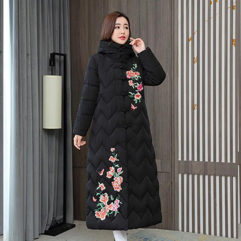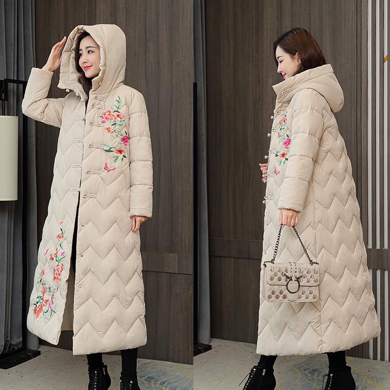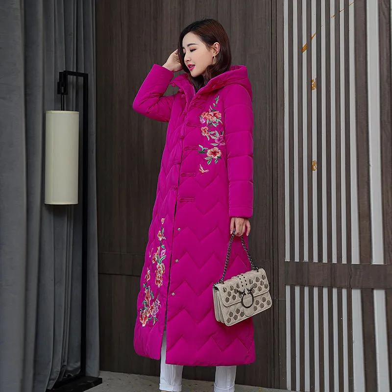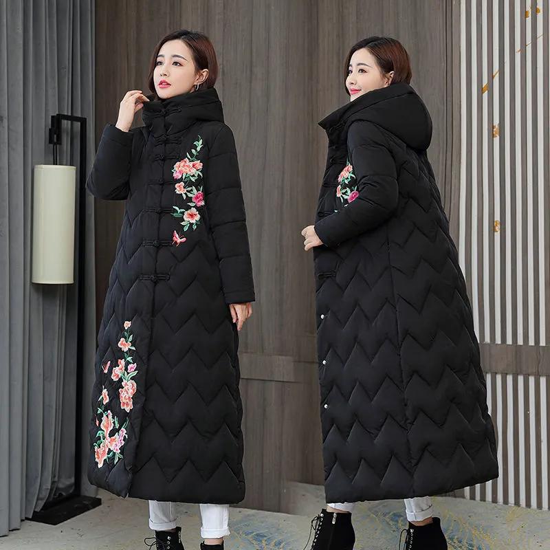Зимняя пуховая хлопковая подкладка для женщин в китайском национальном стиле с вышивкой, длинная верхняя одежда, утолщенная теплая парка с капюшоном, женская