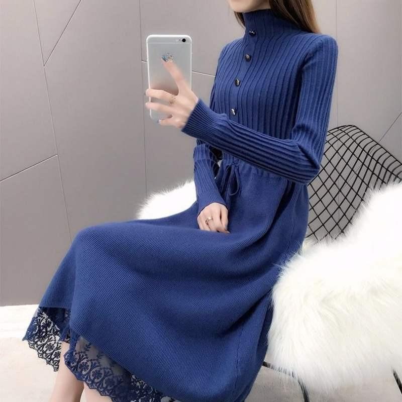 Длинное платье до колена для женщин, однотонное, с длинным рукавом, теплое вязаное платье для осени и зимы, вязаный свитер с полувысоким воротником