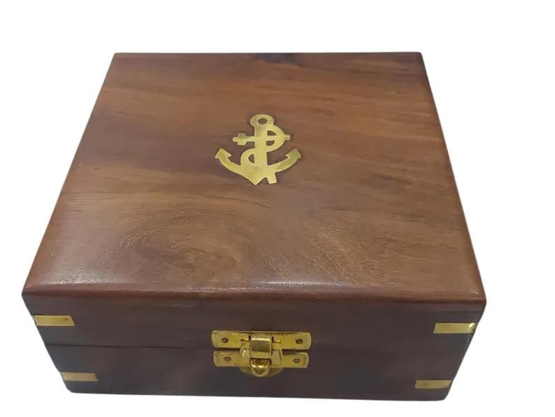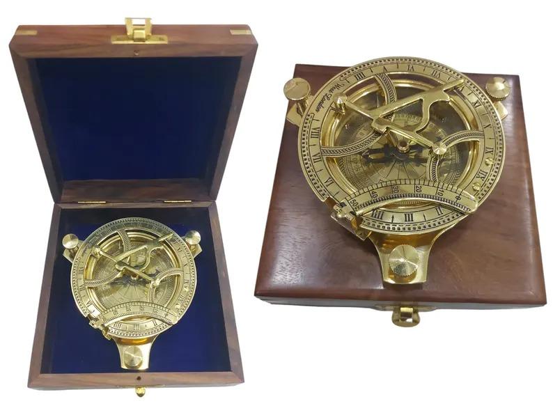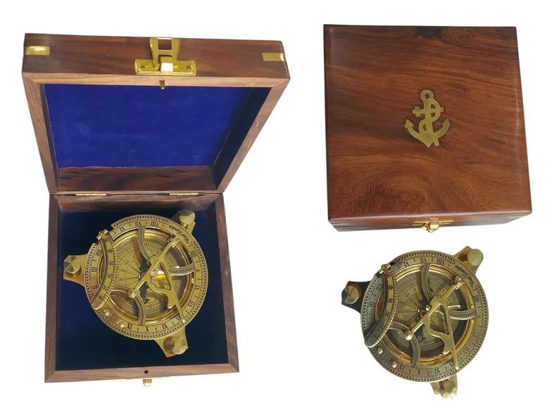 Vintage Brass Compass Sundial with Sheesham Wooden Box