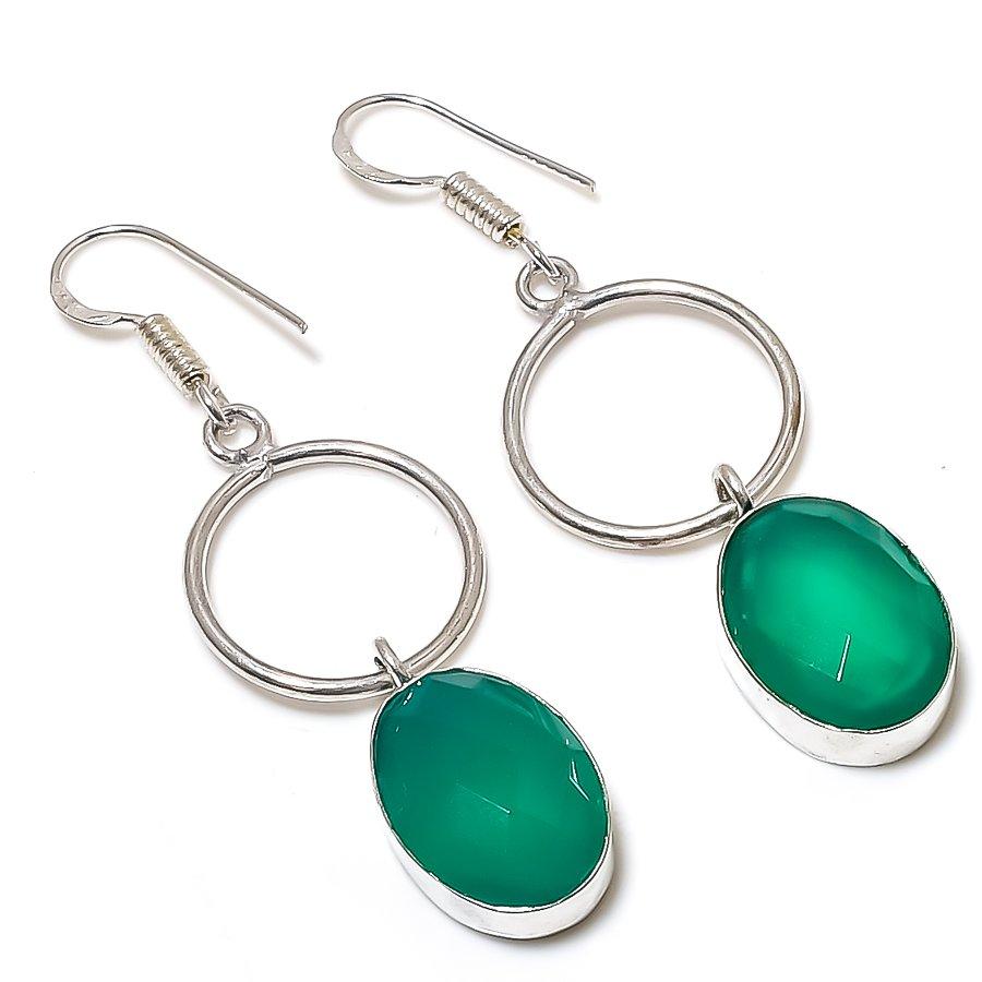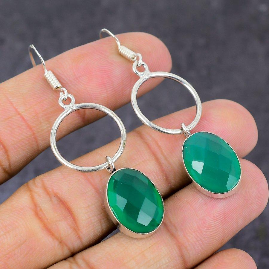 Зеленый Оникс Драгоценный Камень 925 Стерлинговое Серебро Подарок Ювелирное Украшение Серьга 2.25"