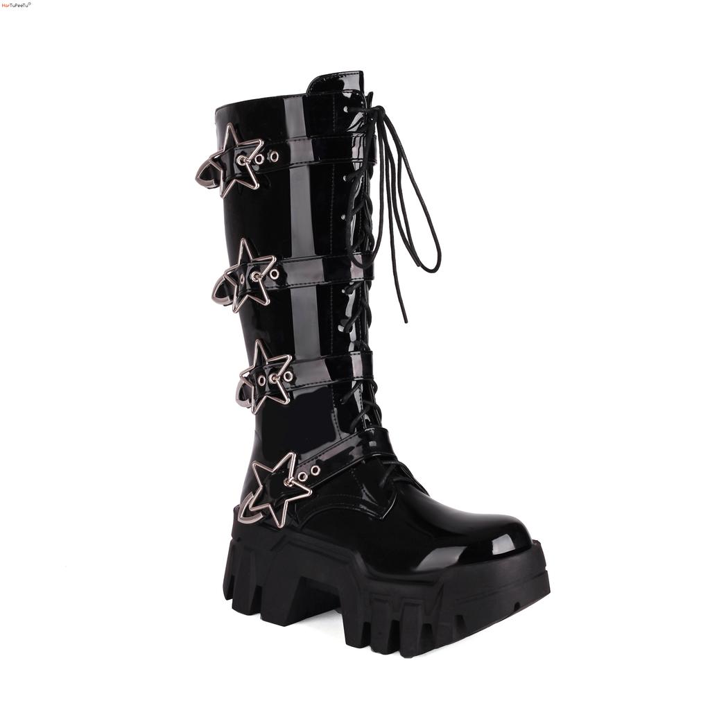 Женские панк ботинки на высокой платформе, мотоботы до середины икры, готические черные массивные танкетки, звезды, тяжелая обувь для тихой дискотеки