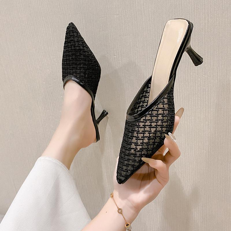 2025 лето баотоу полусабо девушка носит тонкие каблуки ретро сетчатые туфли на высоком каблуке крутые шлепанцы остроносые туфли в сказочном стиле девушка