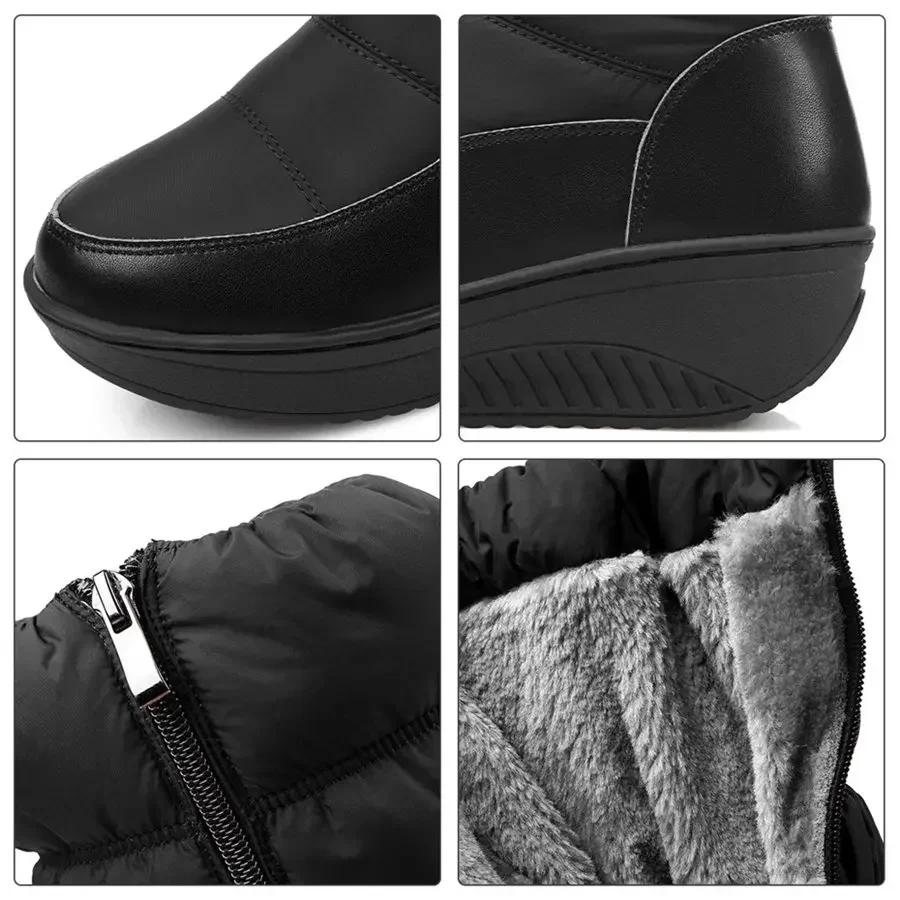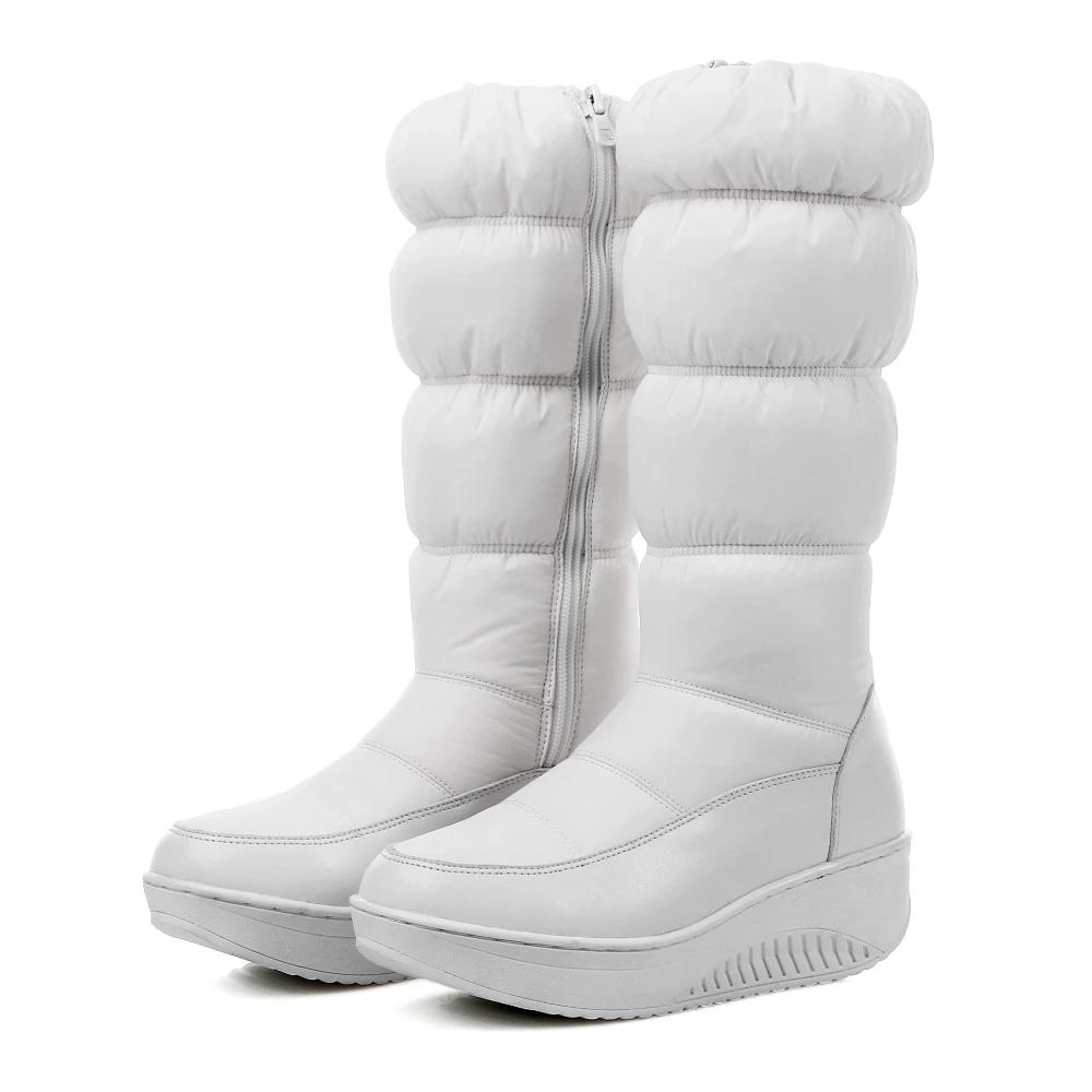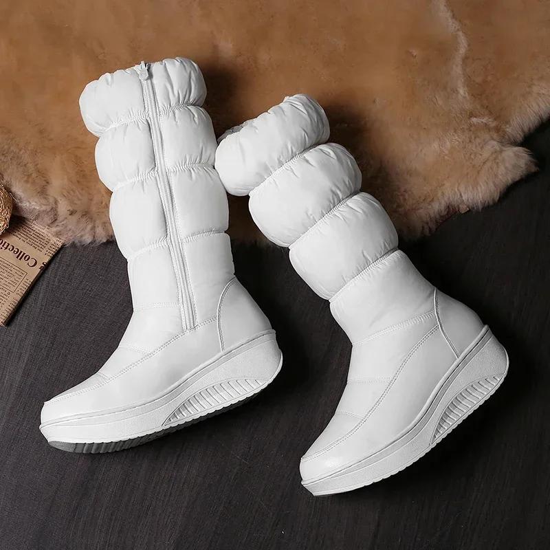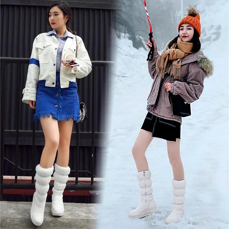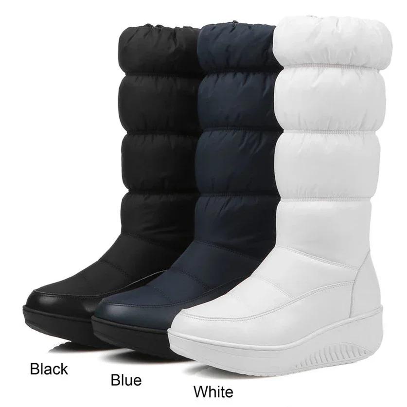 Модные женские теплые плюшевые зимние сапоги до середины икры Черные Белые Водонепроницаемые Пуховые Женские На танкетке Платформе Боковая молния Полусапожки